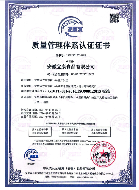 ISO9001质量管理体系认证已成为企业能够提供高质量及合规的产品和服务、内部系统高效应用以提升客户满意度的重要证明。宜康食品获得这一证书,意味着公司符合ISO9001质量管理系统的要求,标志着公司在管理标准化进程上持续迈进。