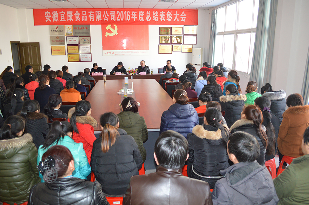 回首过去,熊董事长豪情满怀,他指出,过去一年,在公司全体员工的共同努力下,通过聚焦生产,聚焦市场,聚焦创新,聚焦品质,内抓管理外拓市场,保持了公司各项工作稳步发展的良好势头,取得了较好的业绩,全年实现销售收入3200万元,同比增长10.5%,完成年度目标任务的104%;实现税收126万元,同比增长173%,完成年度目标任务的105%,圆满的实现了年初制定的双目标任务。展望未来,熊董事长雄心勃勃,他希望大家发挥主人翁意识,以企为家,为公司做大做强做出贡献。他强调要以科技创新为指导,以产品开发为抓手,以百合等药食两用鲜榨饮品原料软包装罐头和中餐半成品生产为主导,以粗粮、干货等大别山特色农产品分装为辅助,以实现企业经营与管理从单一的目标式管理开始向系统化、科学化管理转变为中心任务,按照“实施品牌化经营、严控产品质量、健全营销网络、延伸产业链条、完善售后服务体系”的要求,努力把宜康食品打造成为融研发、生产、销售于一体,产业链条完整,在全国具有影响力的绿色农产品生产加工基地。 2017年争取实现工业总产值1亿元,销售收入9000万元,利税1800万元。