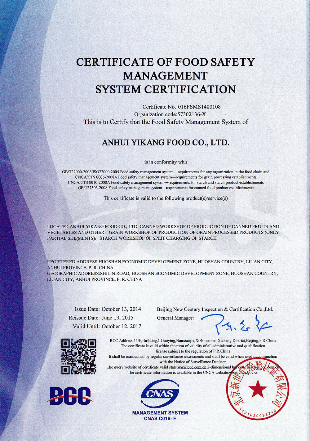 通过审核工作,审核小组对公司食品安全管理工作给予充分肯定,并对现场管理和成品控制提出了更高的要求。在末次会议上,专家组通报了本次审核情况,决定推荐宜康食品更换ISO22000食品安全管理新版认证证书,并于近日获得新版认证证书。此次新版认证证书的获得,有助于宜康食品更加扎实、规范、有效的推进食品安全管理工作,提升企业管理水平!