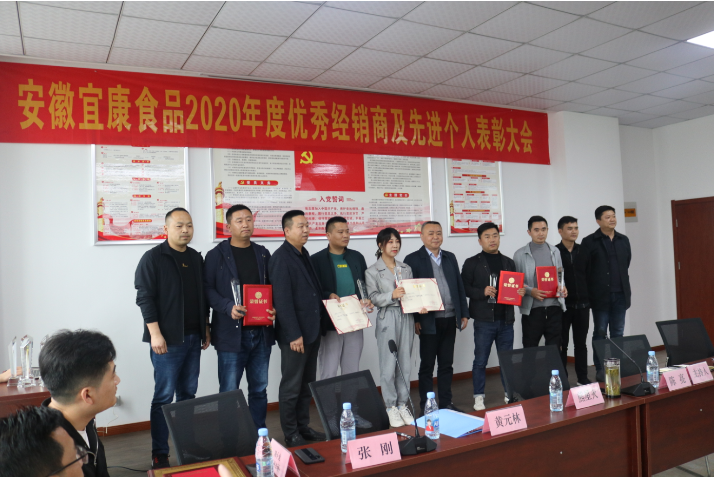 2021年4月24日,宜康食品公司在会议室召开2020年度优秀经销商和先进个人表彰大会。公司董事长熊星火讲话,市场部经理黄元林作工作报告,熊小厨门店运营总监孙大应宣读表彰决定,总经理陈亮主持会议。