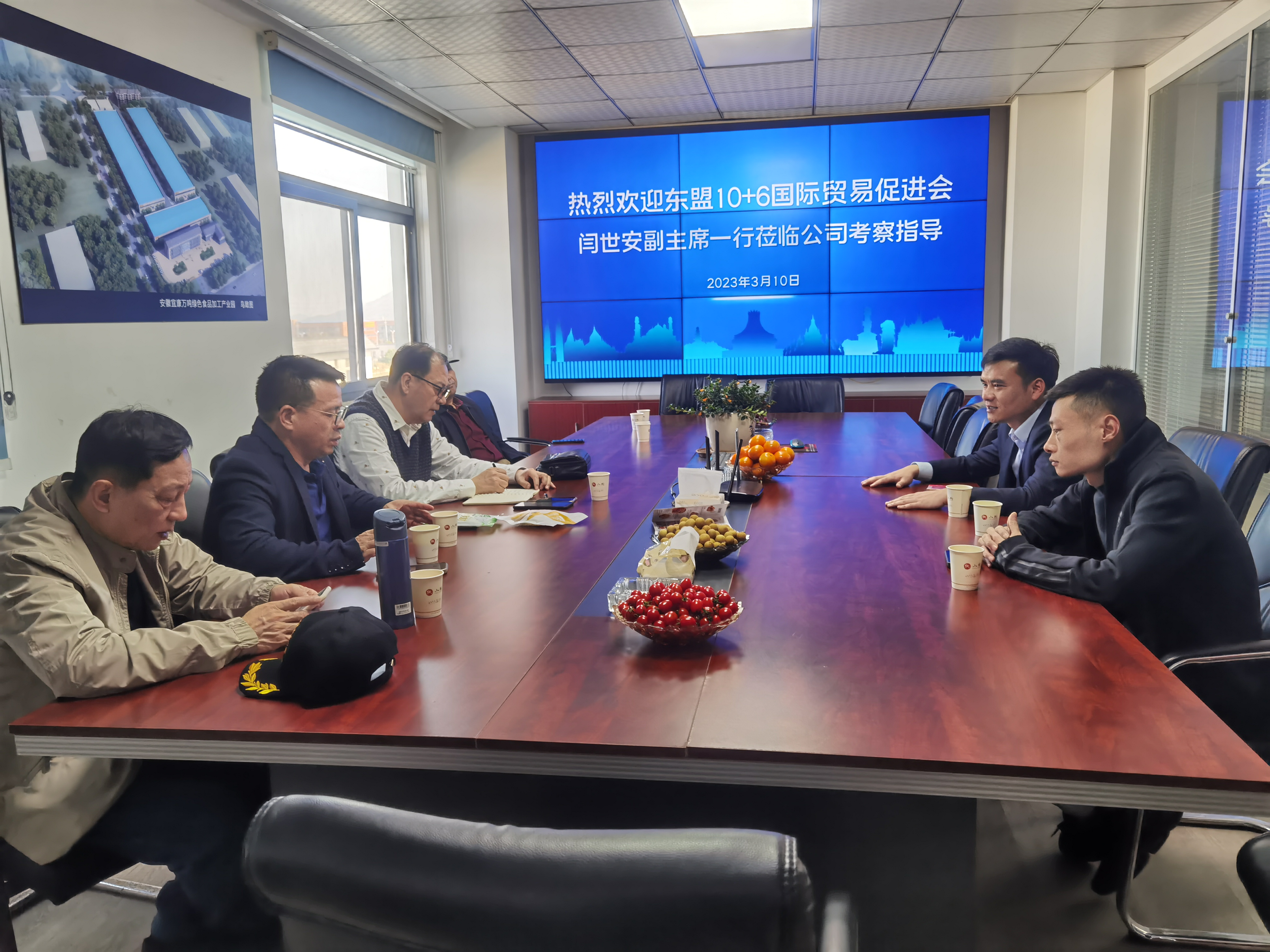 3月10日,东盟加六国贸易促进委员会副主席、执行秘书长闫世安,东盟加六国贸易服务平台执行总裁金国富,高级顾问汪春生,副秘书长宋飞,安徽分平台主任、商合国际控股有限公司董事长张贤胜一行莅临我公司调研。公司总经理陈亮陪同调研。
