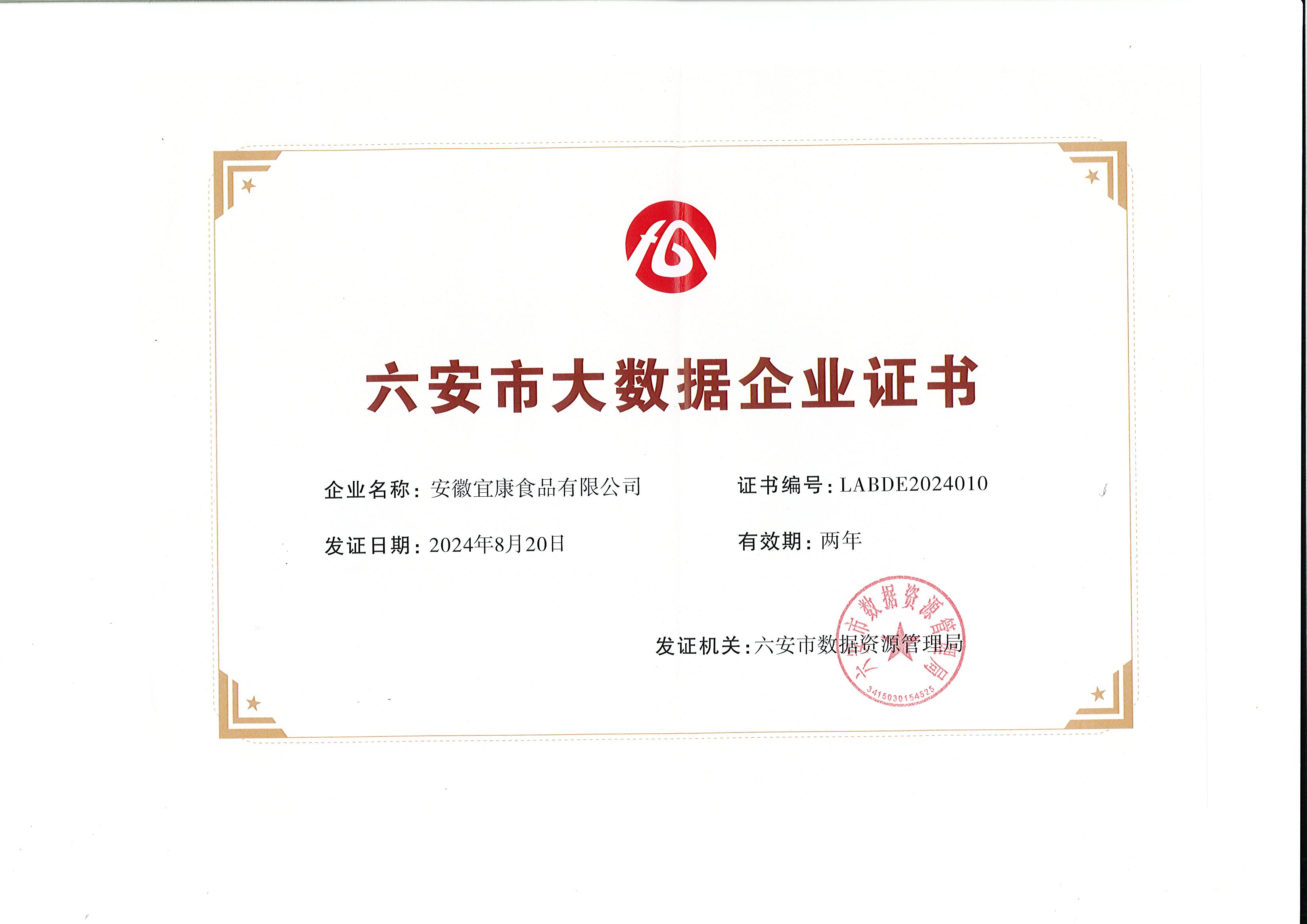 近期,2023年度六安市大数据企业认定结果揭晓,安徽宜康食品有限公司获得《六安市大数据企业证书》。