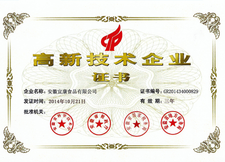 2014年10月,根据《高新技术企业认定管理办法》和《高新技术企业认定管理工作指引》的相关规定,宜康食品被认定为国家级高新技术企业,并于2015年元月收到了安徽省科技厅、安徽省财政厅、安徽省国家税务局、安徽省地方税务局联合颁发的《国家级高新技术企业证书》(编号GR201434000829)。