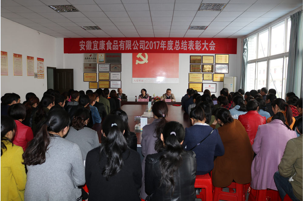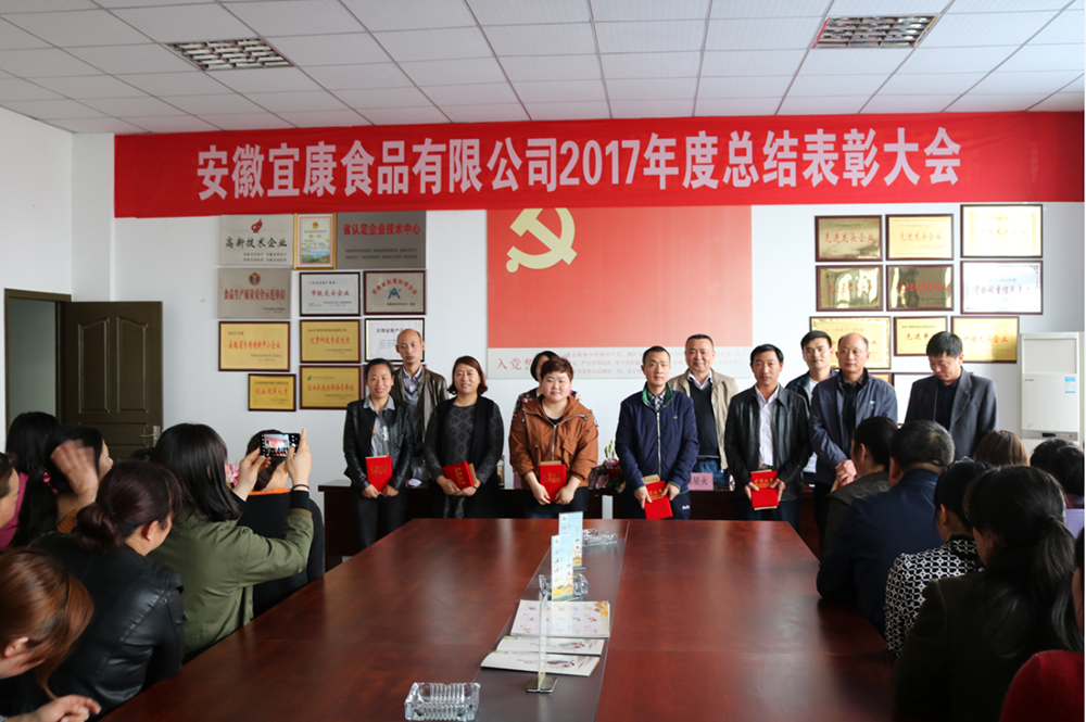 2018年3月30日,宜康食品2017年度总结表彰大会隆重召开。会议全面回顾总结2017年度工作,安排部署2018年度主要工作目标和重点工作任务,表彰2017年度表现突出的先进个人。公司董事长熊星火作大会讲话,总经理陈亮作年度生产经营工作总结报告,公司全体员工参加了会议,党建指导员李芳主持会议。