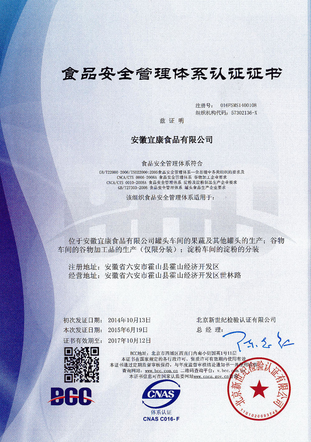 宜康食品自2014年9月取得ISO22000食品安全管理体系认证以来,经过近一年的管理积淀,于6月15日-16日接受北京新世纪检验认证有限公司的食品安全审核小组进行ISO22000食品安全管理体系新版专项技术规范认证转换审核。