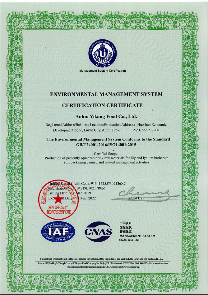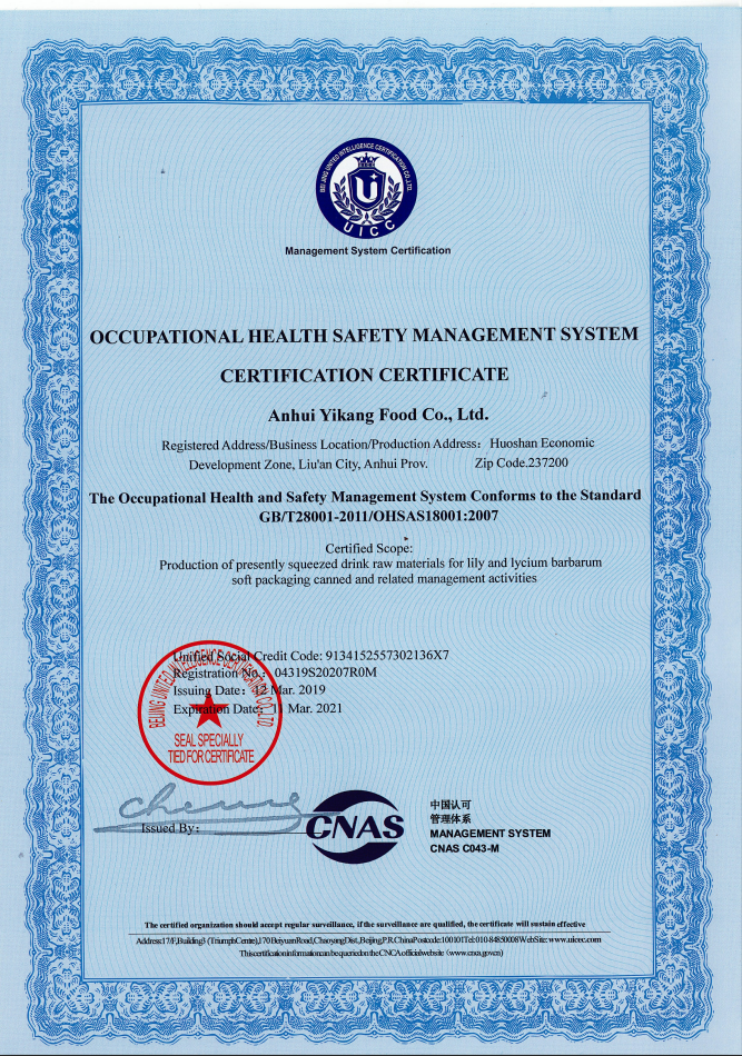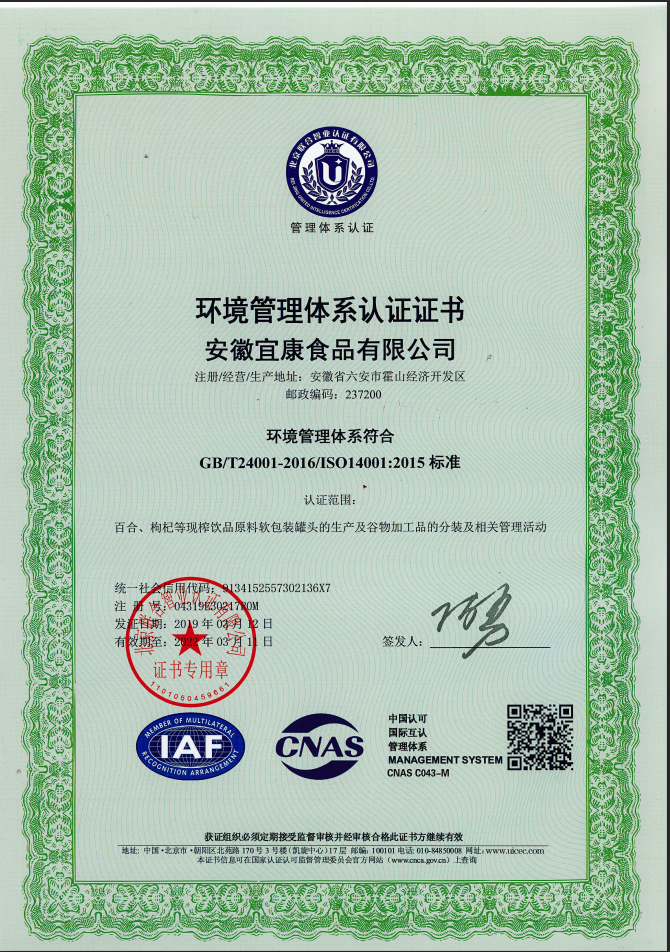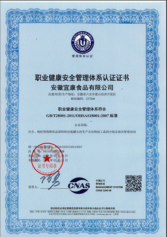 近日,公司生产加工基地---安徽宜康食品有限公司通过专业认证机构的认证审核,获得ISO14001环境管理体系认证证书及OHSAS18001职业健康安全管理体系认证证书。